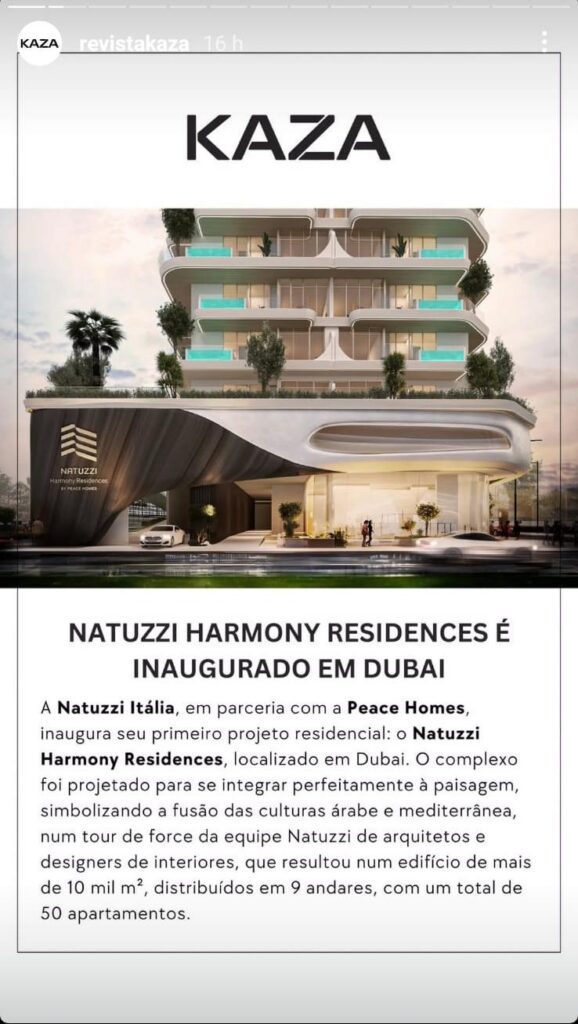 Natuzzi Italia, em parceria com a Peace Homes, inaugura o projeto residencial Natuzzi Harmony Residences, localizado em Dubai. O complexo foi projetado para se integrar perfeitamente à paisagem, simbolizando a fusão entre as culturas árabe e mediterrânea.